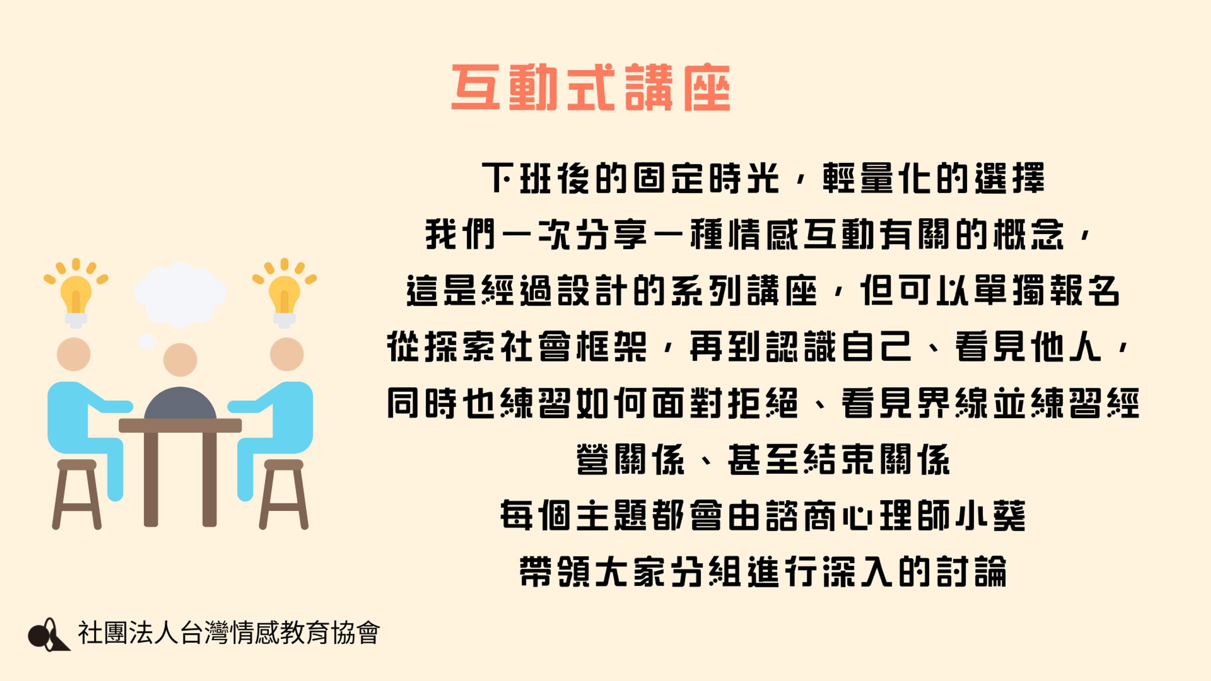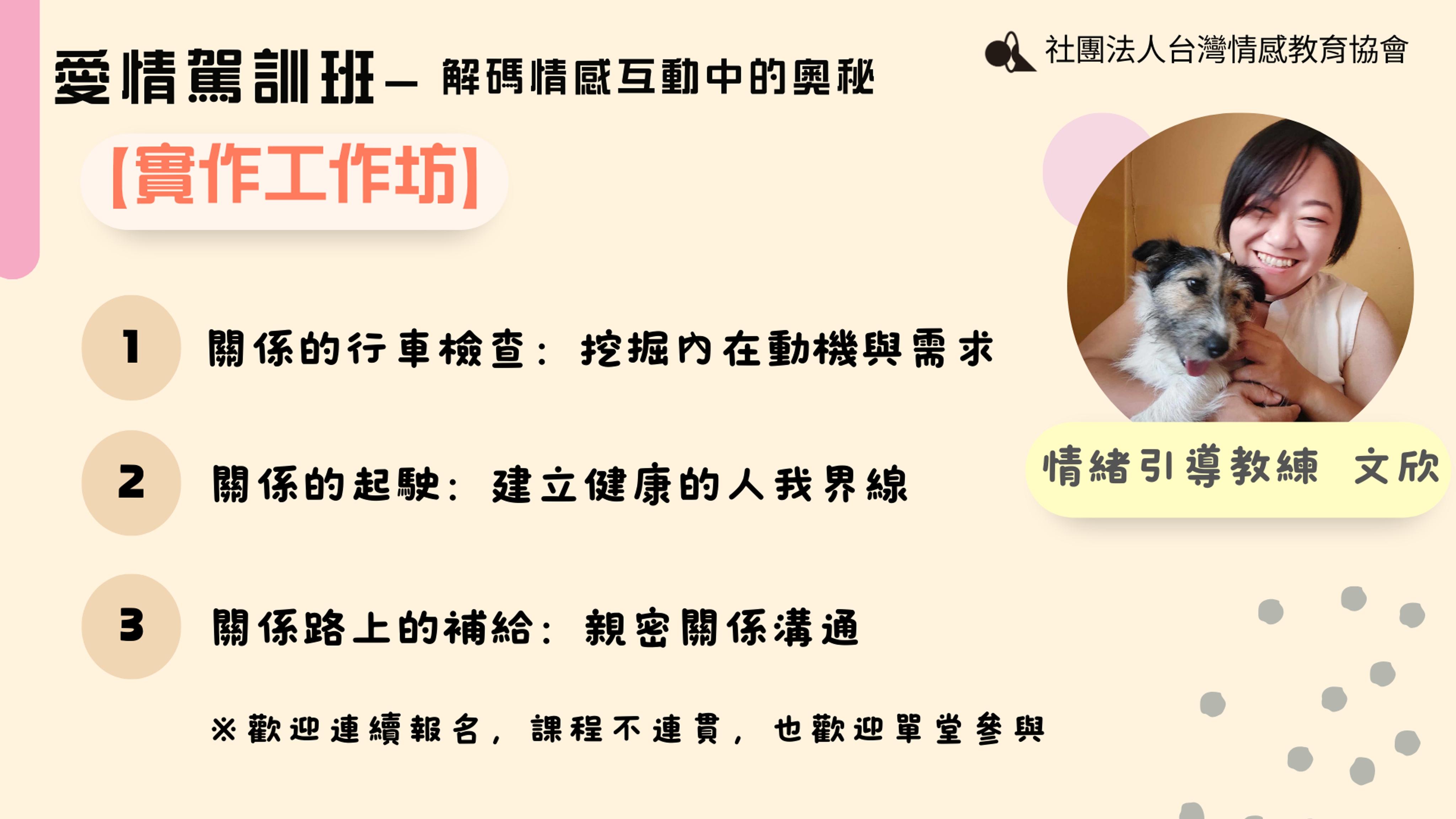 🎯 適合對象:適合任何希望探索與深化情感關係、提升溝通能力、並在情感道路上更加自信的夥伴。