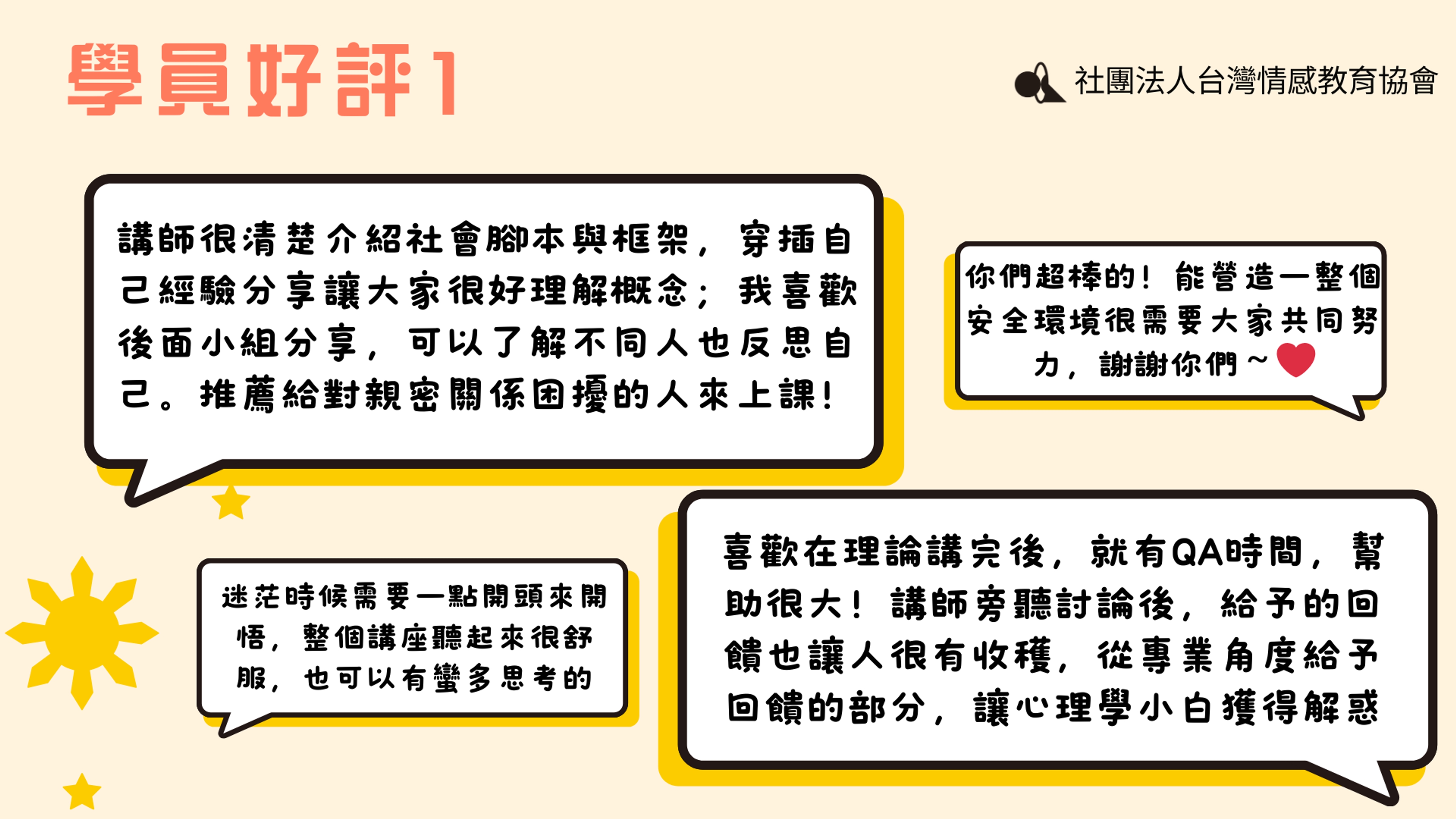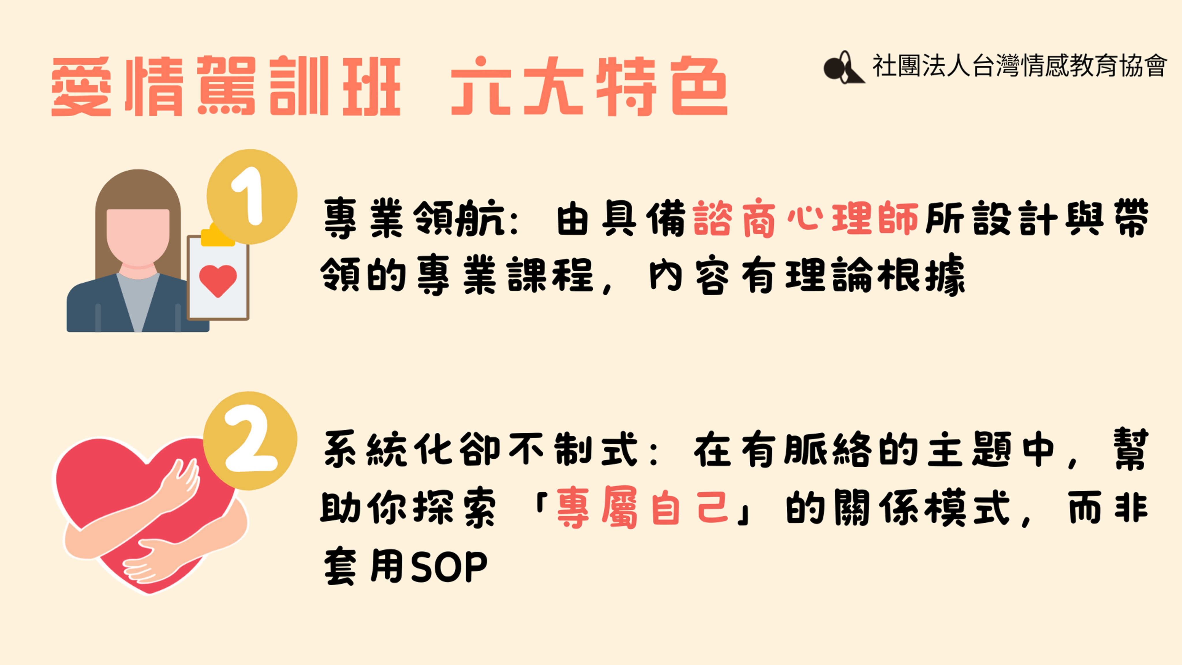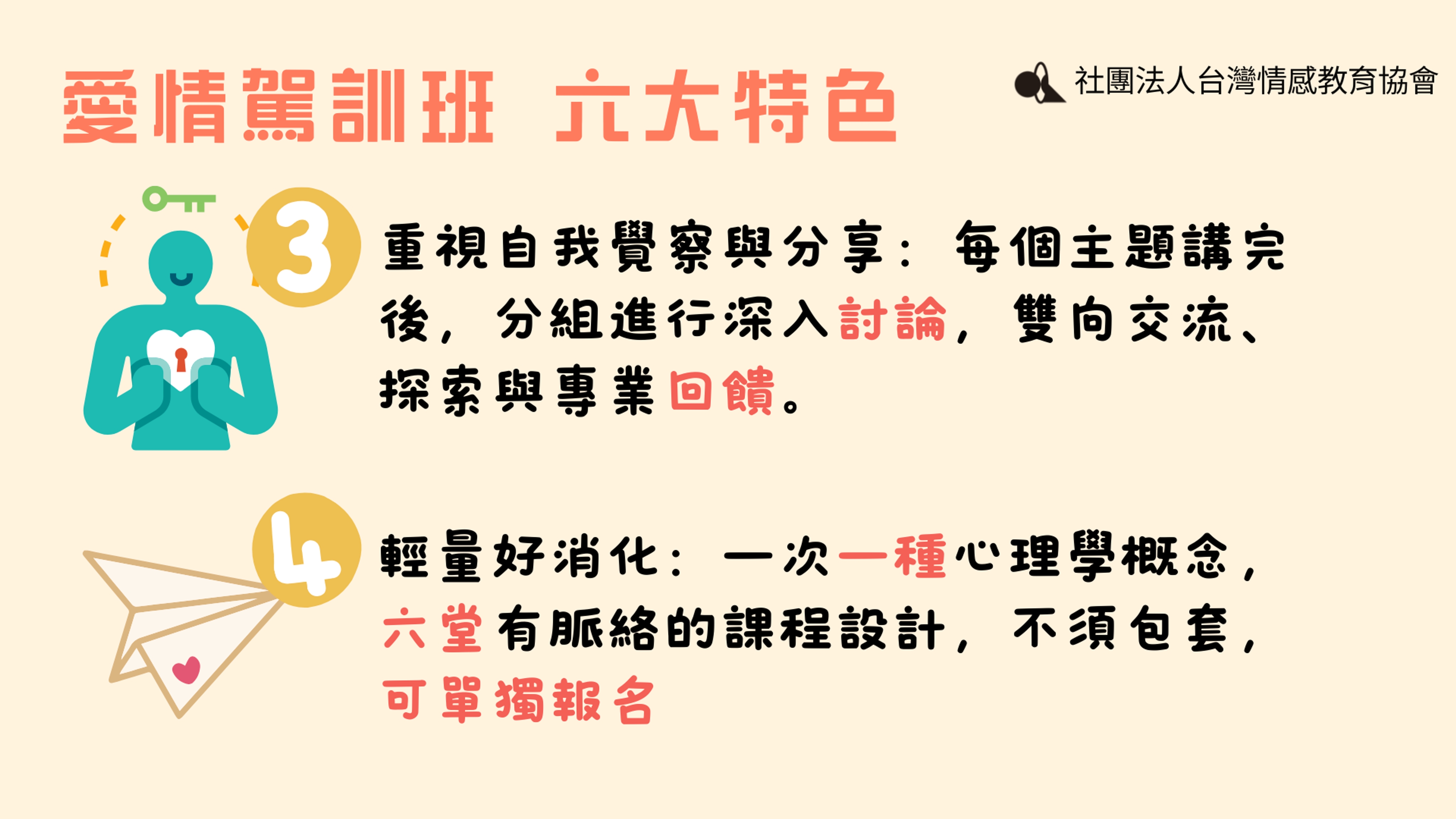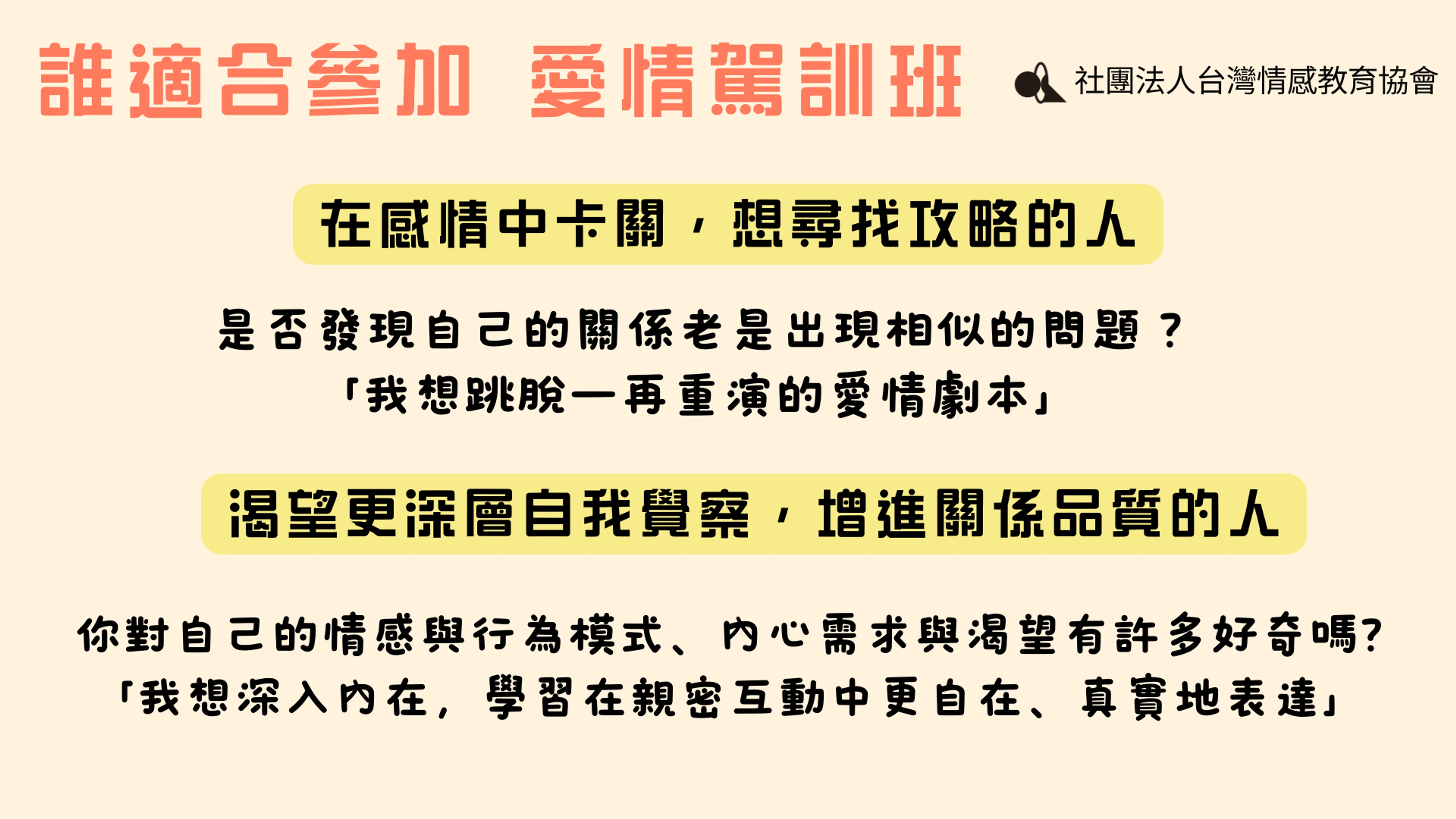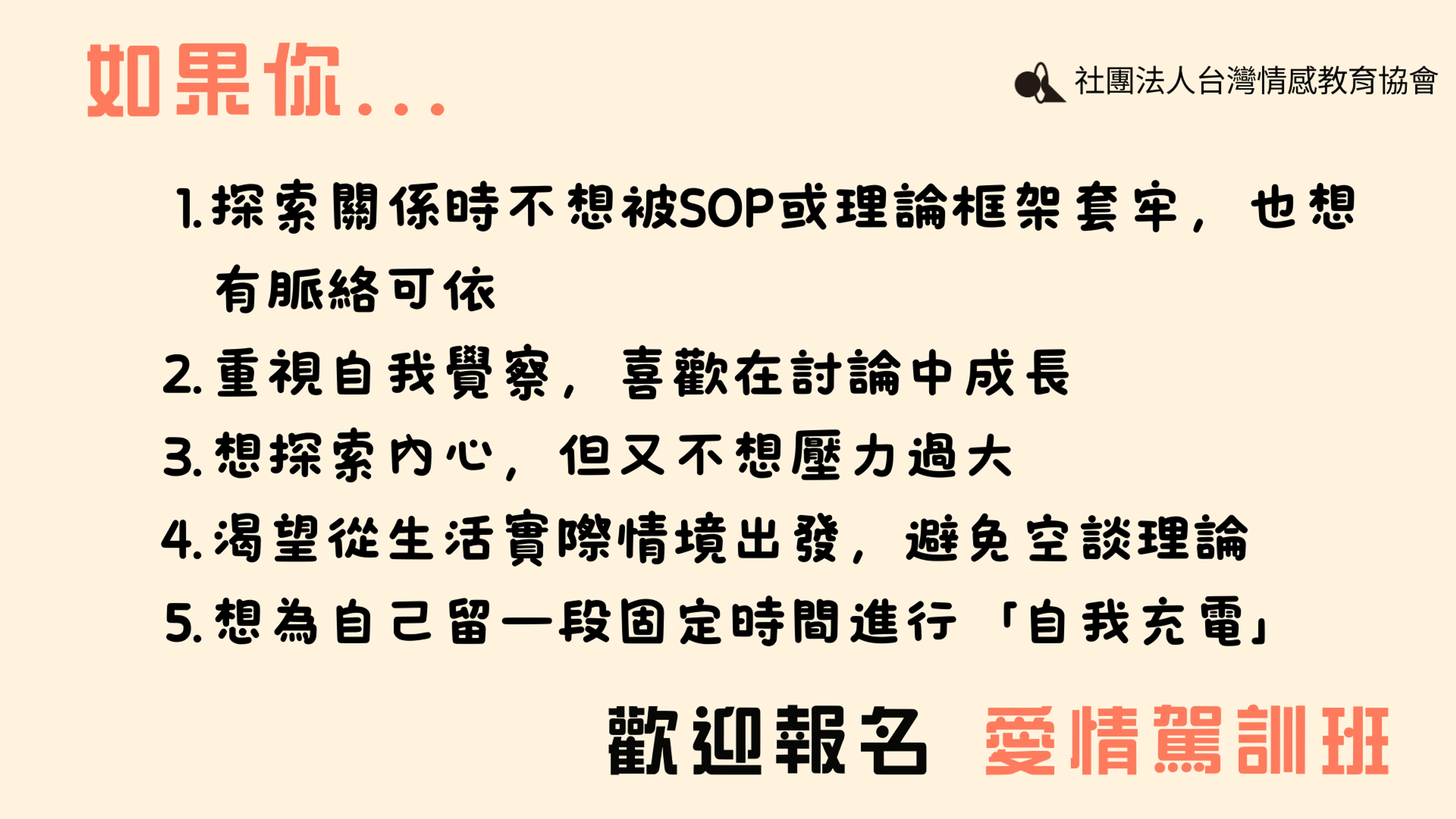 - 增加情緒辨識技巧,促進自我覺察,讓你在親密互動中更能「適時剎車」或「適度加速」,避免關係失控