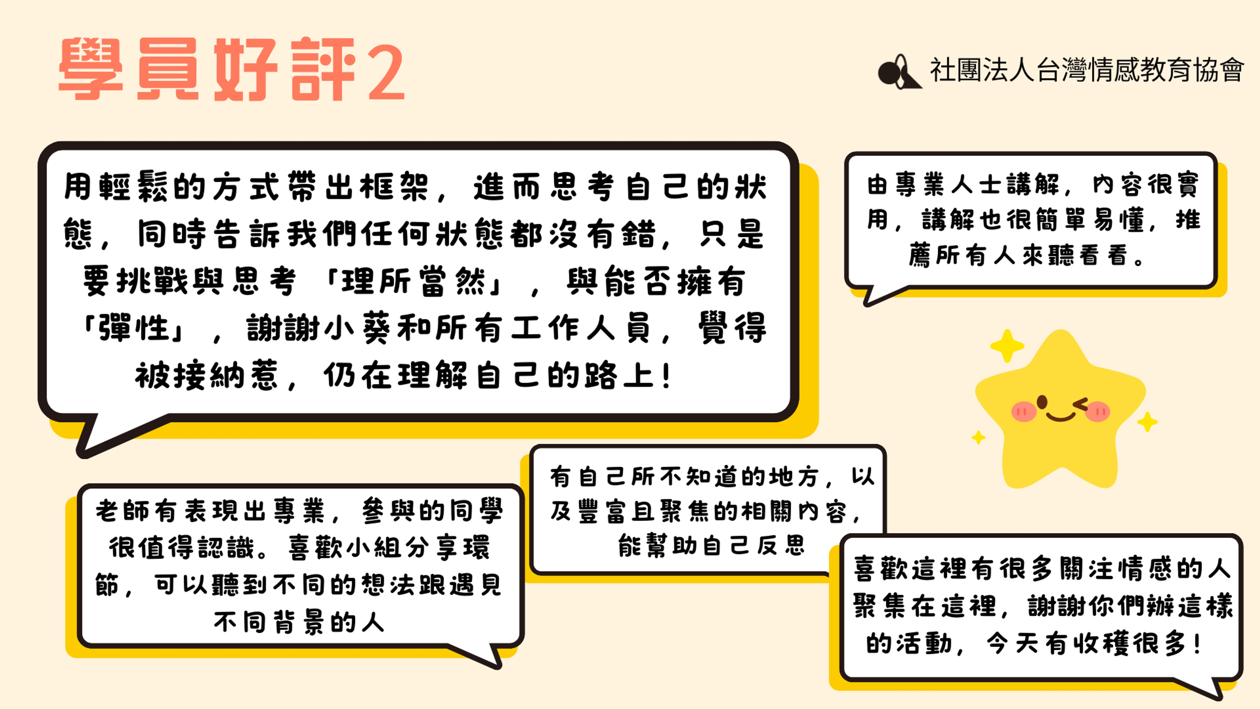 - 透過自我覺察和小組對話,學習以更真實、溫柔的方式看待自己。