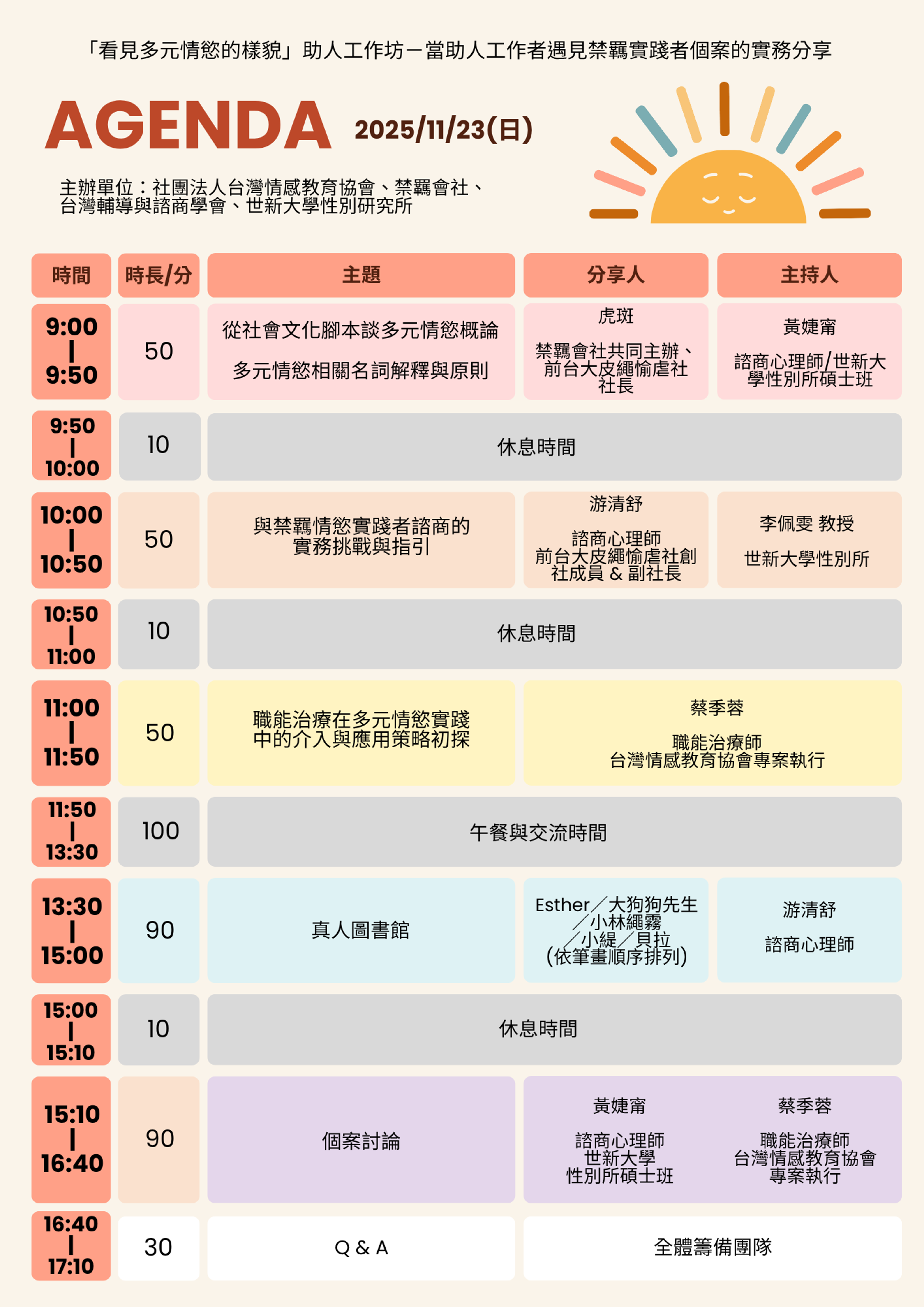 無論您是否已有相關經驗,都非常歡迎一起參與與探索。讓我們一起探索如何成為更能支持案主多元情慾經驗的助人者🌈✨